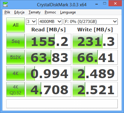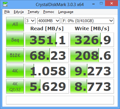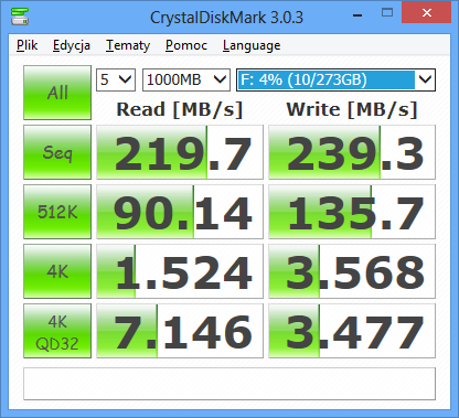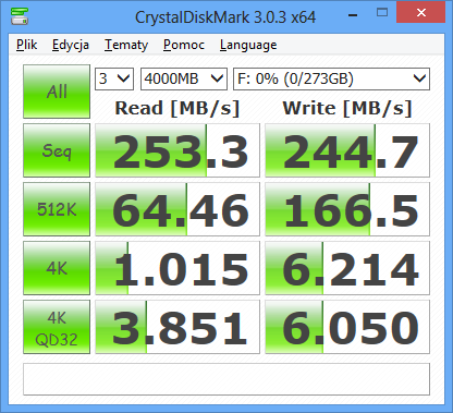 Odczyt jest nieco mniej niż trzy razy pojedyńczy dysk, zapis jest szybszy niż przy dwóch dyskach…