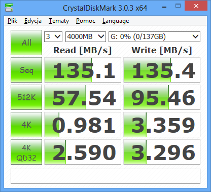 Jak widać szybkość liniowego odczytu/zapisu na pojedyńczym dysku wynosi 135 MB/s.