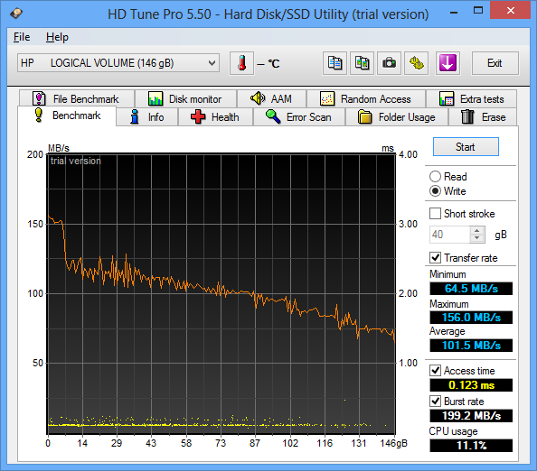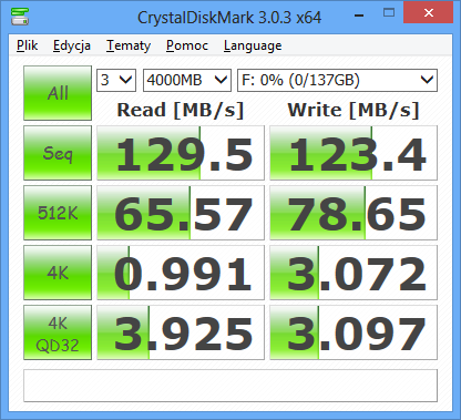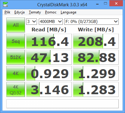 Nie wiem co jest przyczyną niskiego odczytu. Zapis wydaje się być w porządku – 1.3 zapisu pojedyńczego dysku.