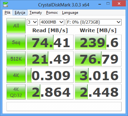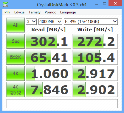 Włączony write back – stąd szybkość zapisu ma się nijak do rzeczywistości 😉 nawet przy wielkości sampla 4GB.
